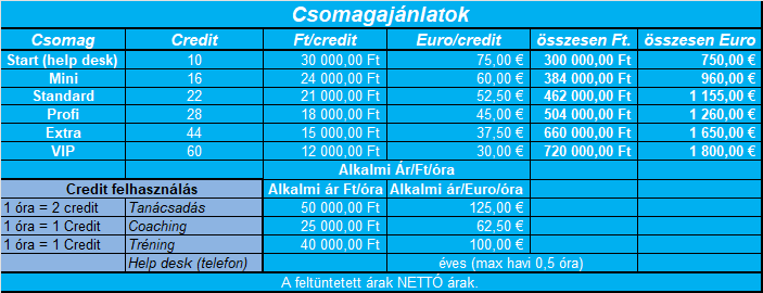 A szolgáltatási csomag vásárlás előnye, hogy a tartós együttműködésre tekintettel, az egyes szolágtatások díja alacsonyabb, valamint a vásárolt creditek felhasználásával a szolgáltatások igény szerint kombinálhatók.